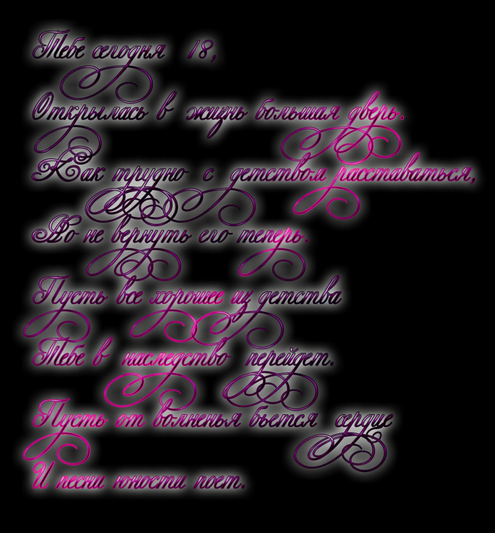 тобой!сердечке доброту храни,— словом не сказать.Мечты исполняй и иначе!Сегодня взрослей и Желаем в совершеннолетиеЖелаем счастья, светлых лет.Уж 18 лет —