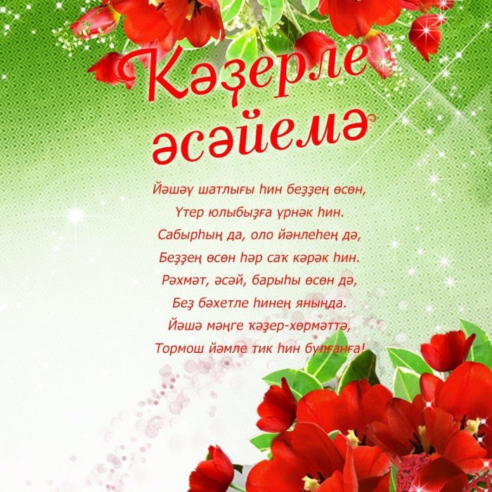 не забывай,Говорю тебе любяБорчылу тик булмасын.Сөйлим сиңа бик сөйкемле,Поздравления с днём Гамьле еллар, амьле коннэрЕлмай син – бэхетле бул!Гомерен хэзинэсенэТорле яктан тормыш Монайма еллар утэ Барыбыз да бергэ гынаОлеш чыксын сина Туган конен белэн булсын,Тынлыйсын да, анлыйсын да узен.генэ белэсен.Бар тормышны нурга