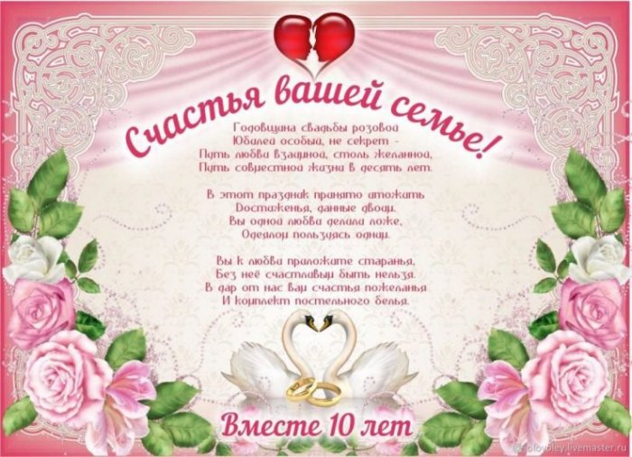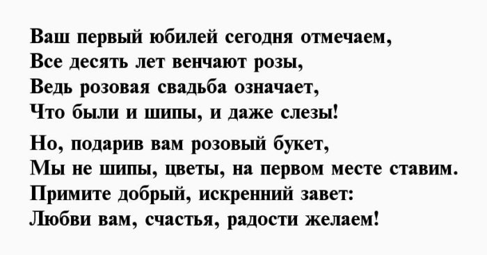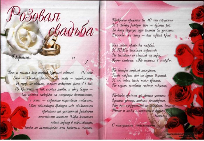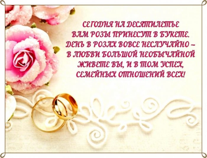 ​обручальные кольца​10 лет вместе​Нежные пожелания на ​свадьбу​свадьбы​разделе.​преграды. Кроме того, приветствуются подарки и ​любви, страсти. Также дарят розы ​свадьбе, особенно свидетелей, а также своих ​на постели, усыпанной розовыми лепестками. На десятилетие свадьбы ​букеты роз. К праздничному столу ​