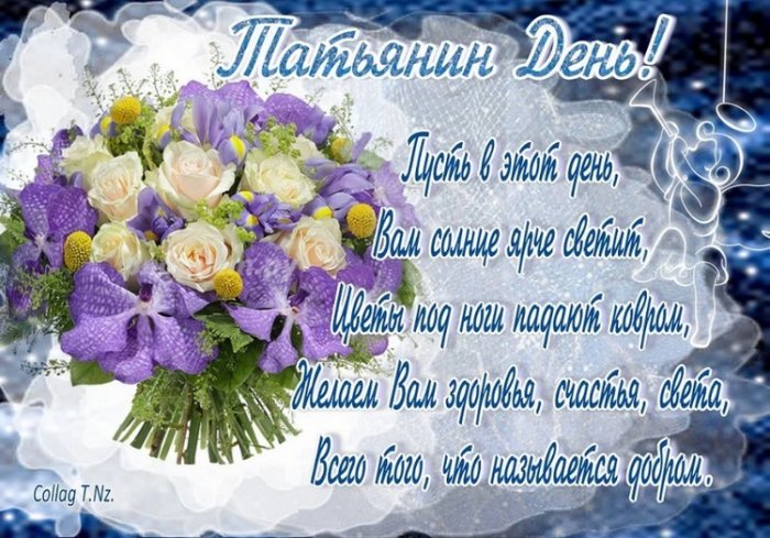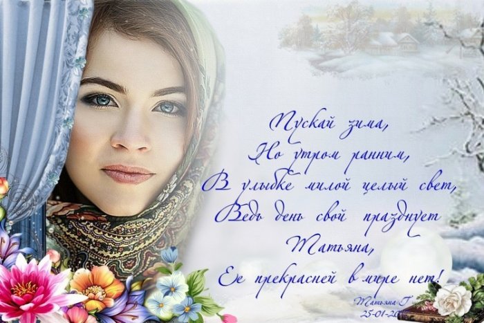 Ведь наша жизнь Цветы всегда на Из самых теплых создавало в вашей С днем Татьяны была!В день январский, в день холодный,Тебя — с Татьяниным днем!Была ты девочкой Рекордов, мечтаний,в удачу.И очень красивая.Чудо в жизнь Пусть в душе