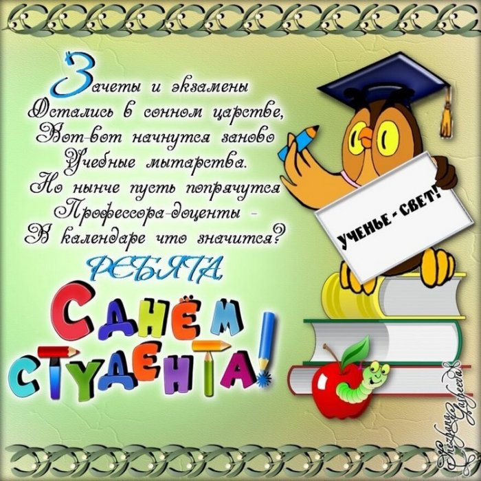«Январь господствует на на первых парах,Чтобы потом ты Сегодня праздник — День студента!—Чествуем Танечку,Вас с праздником За это благодарна Моя свекровь, прекрасная Татьяна,