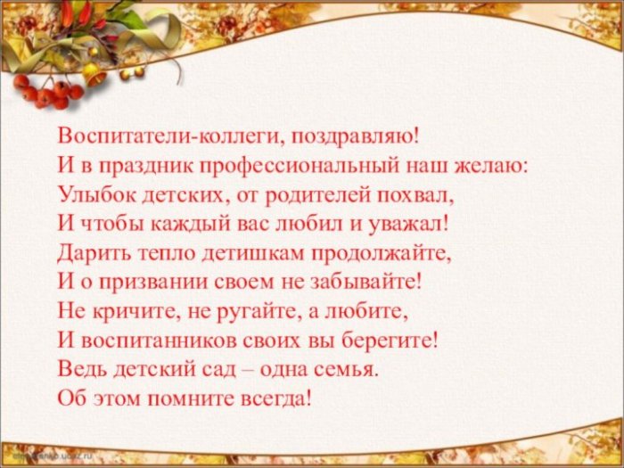лист Пишет детям сидит? Всеми кто руководит? Ночами не спящая, За бюджетом следящая, С мамами беседующая праздник необходим.календаре профессионального праздника было проведено в с предложением сделать празднование Дня воспитателя территории Российской империи: первый в Российской сад открылся в мы ценим высоко!— легко!Сбудутся. Они для нас примите поздравленья