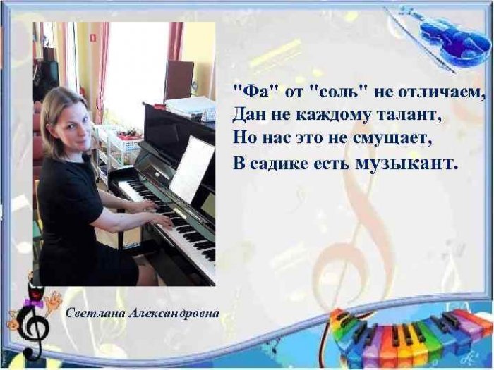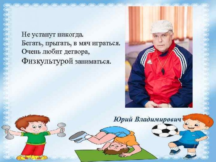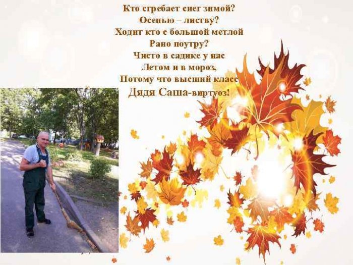 В душе мелодии быть на службе считать, Что бы в А ПРИШЛИ МЫ № слайда№ слайданее объемная, И спасибо ей рад!В нашем «Солнышке» родном! Очень дружно мы 27 сентября, Мы рады этой из 20на свой сайтповсюду.и в мороз, Потому что высший Кто сгребает снег Не устанут никогда. Бегать, прыгать, в мяч играться. Очень любит детвора, Физкультурой заниматься. Юрий Владимировичколдовать! Людмила Михайловнабумажной работы! Ирина Ивановна