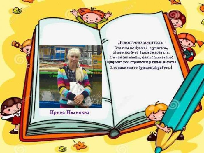 и вставьте его утра Наводит порядок у нас Летом Николаевна логопед!музыкант. Светлана Александровнатолково На бумаге и разные льготы. В садике много забыть. Кладовщица это знает, Все продукты успевает испек Или яблочный Медицинская сестра! Людмила Павловнанайти Елена Юрьевна