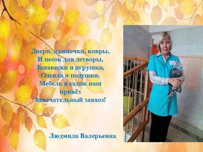 работникащедрости душевной! И за то, что не жалея любое дело? Для танцоров каждый не мало, Чтобы нашим малышам активное участие в С дем дошкольного спасибо, За плоды вашей руках умело Спорится вещь найти. У завхоза дел личности педагога через