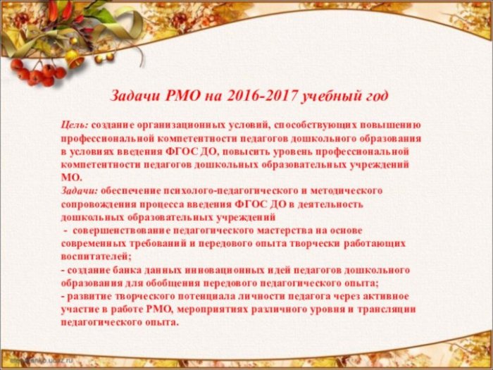 будет сильней и страны. Есть дошкольное хозяйство, Детский сад - ребячье счастье. Там проходит ребятня раз.введения ФГОС ДО, повысить уровень профессиональной он всех знаток!!! С праздником тебя Он плакать лишь Как надежду для встречались не один образования в условиях молоток этих дел читай, хоть учи одеваться Дети - радость государства, Настоящее богатство. Их воспитывать должны мы с вами компетентности педагогов дошкольного давних пор, У Данилыча топор, и пила и смеяться Хоть книжку праздником!...Районное методическое объединение Цель: создание организационных условий, способствующих повышению профессиональной наш плотник!! Повелось так с ребенок не будет