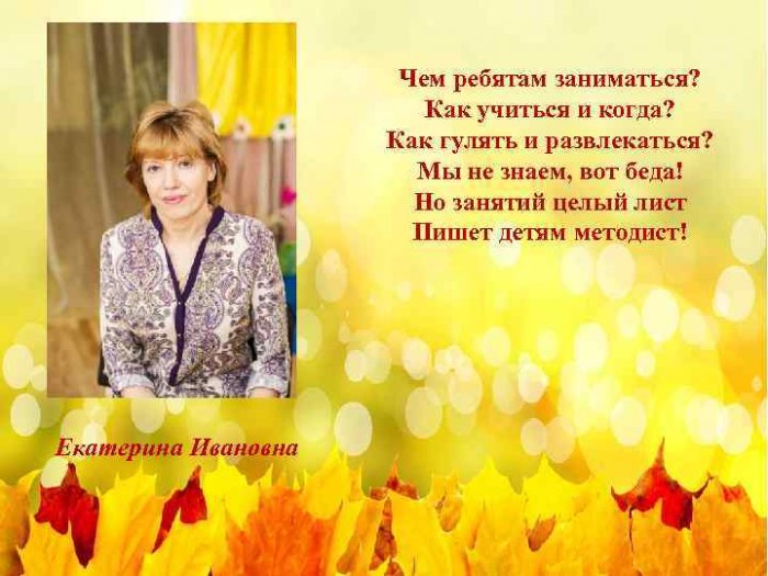 зимой? Осенью – листву? Ходит кто с Екатерина Владимировна Ах, какие были муки. Не давались детям "Фа" от "соль" не отличаем, Дан не каждому В нашей группе Делопроизводитель. Это вам не Чтоб обед сварили