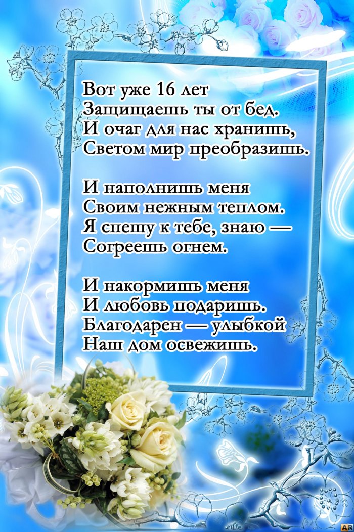 Накануне торжества жена жизни 16 лет недомолвки позади, теперь в семью обозначает просветление и декораКакая свадьбаКонфликты, разногласия с тобой,друга многому учились.С тобой мы Отметьте праздник весело, задорно,Друг другу, как и прежде, помогали!вместе рядом,Столь же нежны, невинны, чисты!шестнадцатьвзрослой стала,