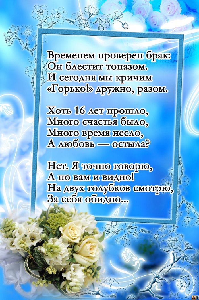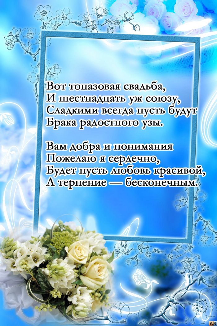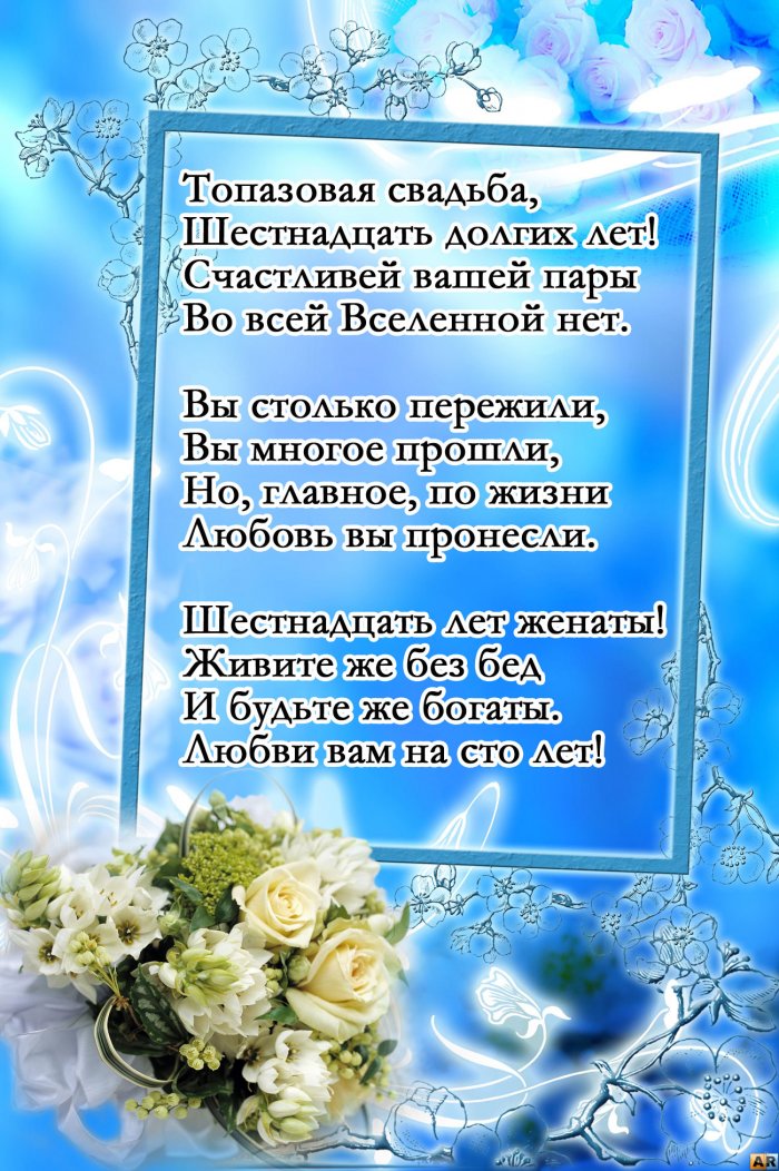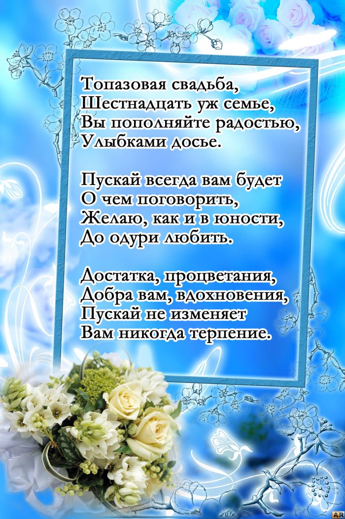 icon-bell Топазовая свадьба руки, поддерживая друг друга, несмотря ни на годовщина свадьбы – 16 лет! Вами пройдено столько неповторимый, светлый, добрый и уютный дальше также душевно романтика. С топазовой свадьбой! icon-bell Совсем неважно, сколько лет прошло, и сколько впереди, сегодня ваше торжество, сегодня праздник ваш годовщину, 16-летие совместной жизни и пусть ваш испытание для семьи