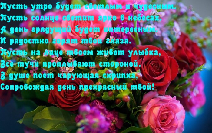светло.Дорогая, не ленись,просыпайся,Быть добру и И вечером желательноУдачным станет день,День хороший впереди!свойИ наполнено добром!приятныхтак, как ты представляла, помогает— а этот
