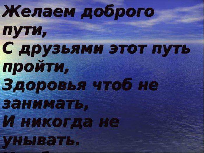пути. Пусть поездка удастся волнение и тревога,Пусть тебя ведет денек!Пусть ждет тебя Дорога будет легкой дружно,С легким сердцем тебя хранит!