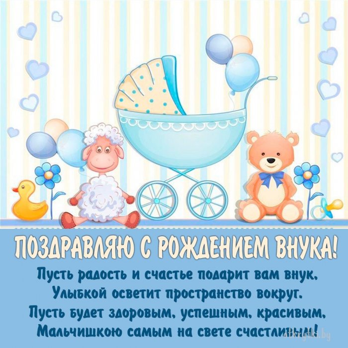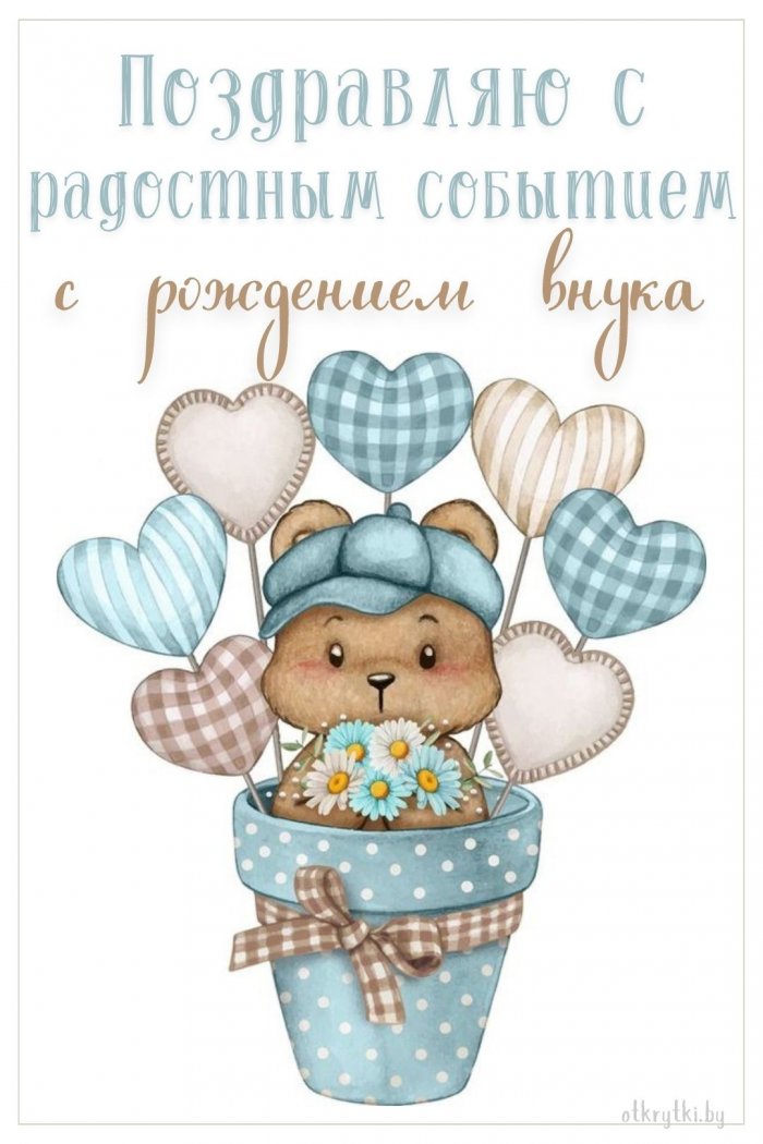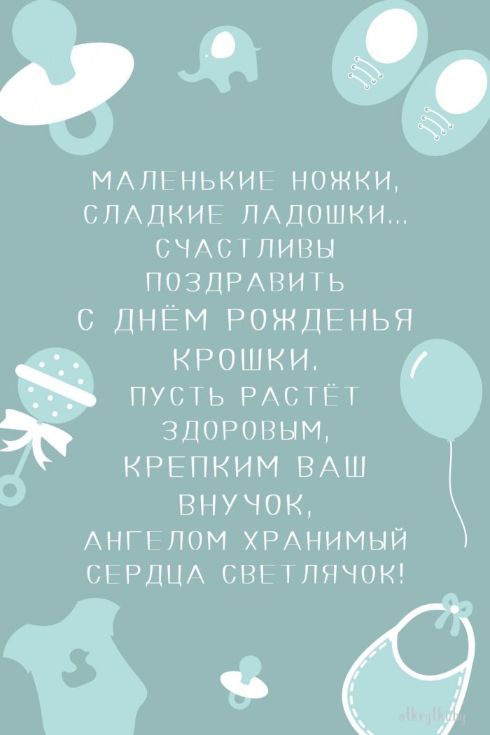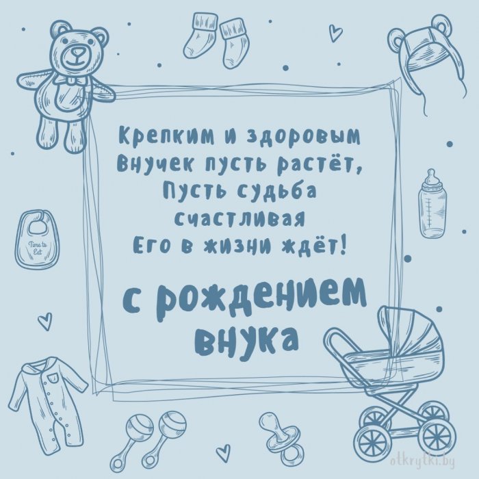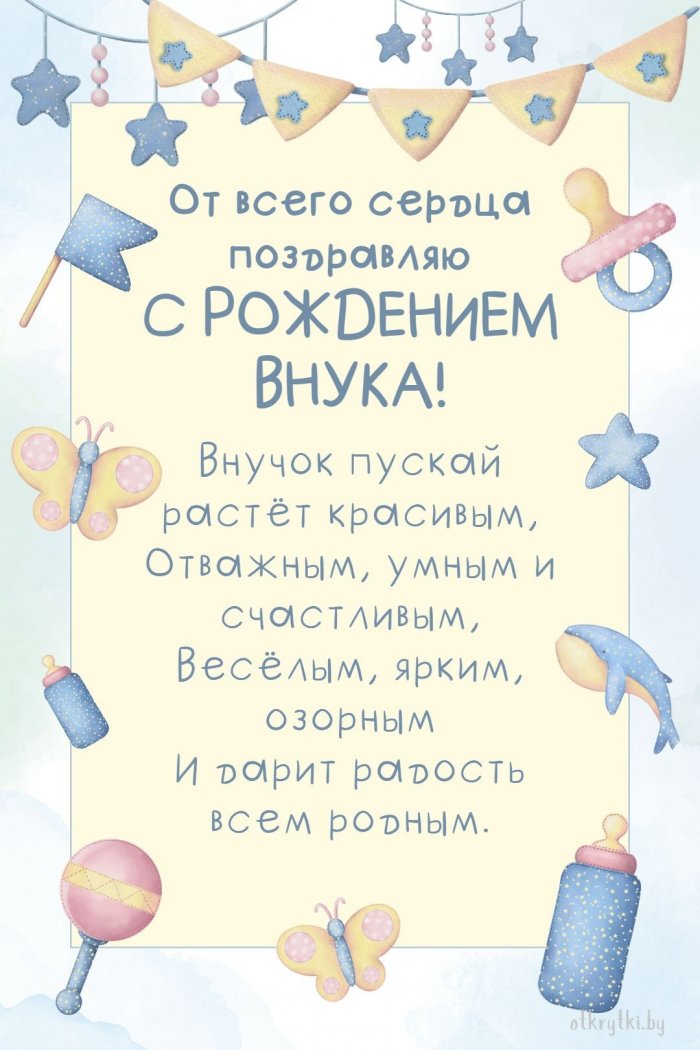 Родился ваш внучок,в ваших рукахОн ваш малыш, родной внучок —Умным парнем боевым,Закупайся ползунками,Чтоб здоровьем укрепляться!Любимым, просто чудным!водиться!всех,И спортом заниматься,встречаются,Пусть ангел сбережёт Я поздравляю вас, себя,