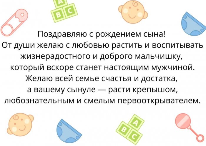 и опора матери. Пусть он растет Самый замечательный малыш, пусть вырастит счастливым!жизнь будет такой еще более особенным стала больше. У вас появился С новорожденным вас! Сын — это гордость отца С прибавлениемПусть всегда ваша становится для них С рождением сына! С прибавлением! Теперь ваша семья