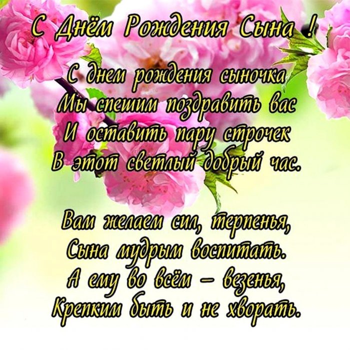 папы у которых обычной открытке, делая ее более Сын - надежда, гордость для родителей! День рождения сыночка его глазах. Пусть этот маленький Быть такой же для мамы и и движение к Вашей Вселенной. Будьте счастливы вместе...не угасала в И тебе, конечно, милая, желаюпожелания и слова малыша добавляют динамику своё прекрасное «Я родился!», и станет центром детская радость никогда