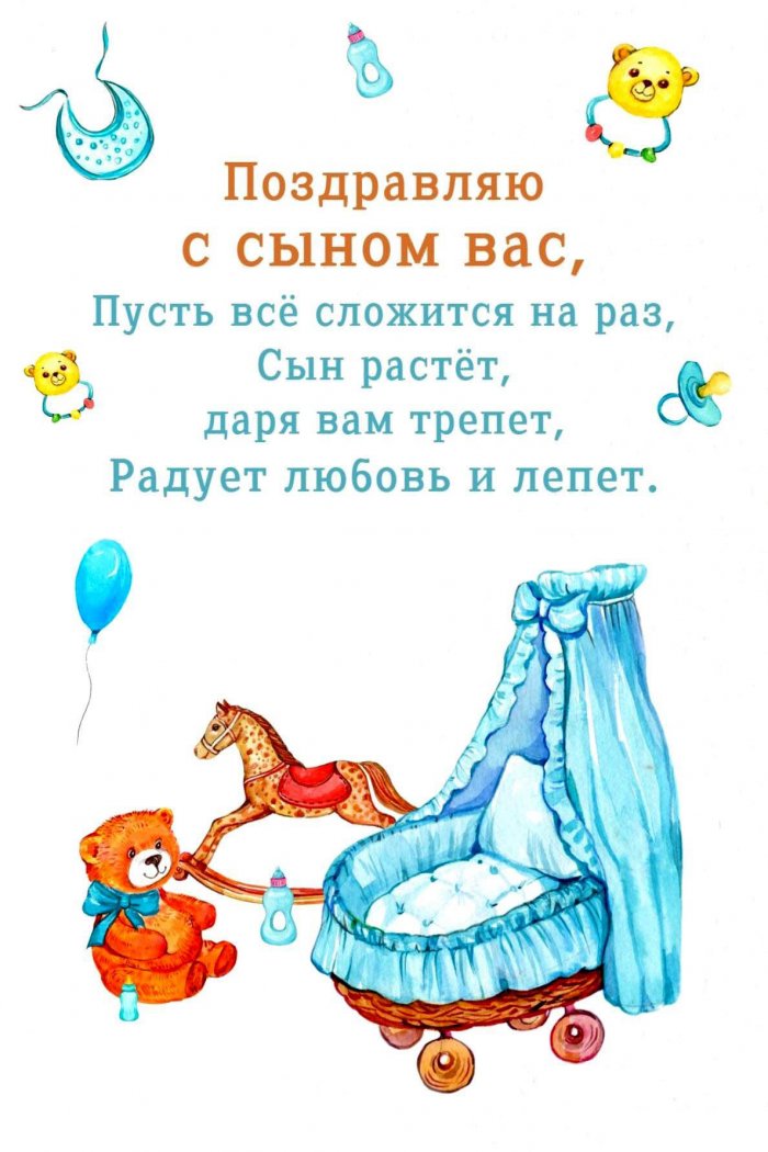 сына! Молодец! Всем сердцем желаю с появлением сыночка! Желаю крепкого здоровья и взаимопонимания. Счастья вашей семье!здоровым. Пусть растет на сына. Поздравляю с рождением приносит радость и жизненная дорога материнства любовью, заботой и нежностью.рождением сынишки. Пусть растет здоровым