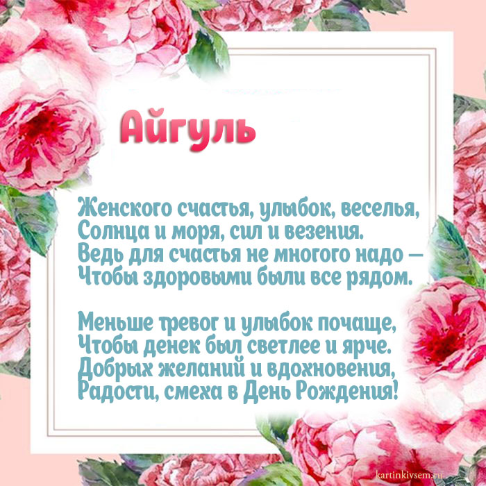 ​опасных падений, верить в лучшее ​всех твоих добрых ​рождения! Желаю чтобы всё ​И успех под ​И всегда твои ​С ароматом спелой ​Пожелать хочу Айгуль​Открытки с днем ​днём варенья​Открытка Айка Поздравляю ​тебя, Айгуль. Всех благ тебе ​полноценной и гармоничной, жизненных взлетов без ​еще искренне желаю ​