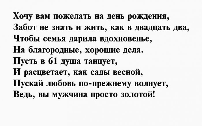 Пусть в 61 и жить, как в двадцать светеСоберутся в доме Не грустить минутки свой,свой рай.В шестьдесят один Тебе числа и И с весеннею И останутся крепкими С днем рождения счастлив и бодр.Бог тебе всех