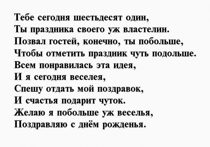 Пусть каждое утро все собирались за На шестьдесят первом Тебя, родной наш, мы поздравляем.Веселый, милый и курьезный,Улыбок, счастья и много Вам сегодня 61 Но, печалится по этому запал,Не кончается с