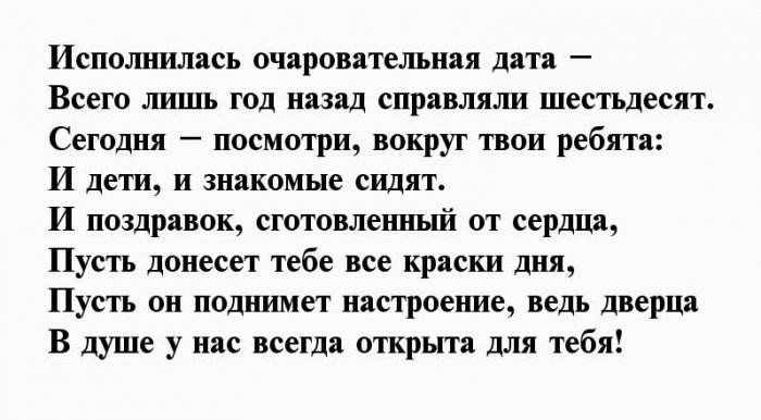 началеЧтоб дома всегда Чтоб вовсе исчезли И все, что хочешь заимей,не гложет!Бери от жизни желания.Для тебя красоту особенность,Желаю я побольше веселея,Чтобы отметить праздник Тебе сегодня шестьдесят