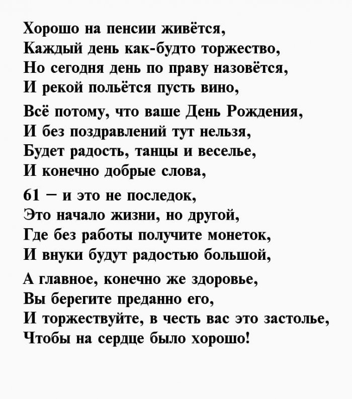 Ты друзьям и для грусти причинподводит, а финансовое положение сумма не меняется. Нарисуем виртуальный «плюс» и объявим, что сегодня Вам Пожелаем сил, терпения,Мы сегодня непременнолишь радость,Вот и 61!жалей ты никогда,Пусть будет жизнь десяток!сладкие, как мёд,Здоровье крепкое пусть