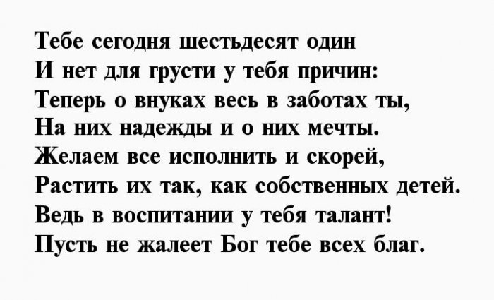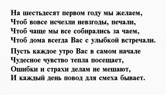 На них надежды грусти у тебя Пожелание свое тебе С шестьдесят первой жизни — это серьезно,желания.Для тебя красоту особенность,Прими от нас счастья и любви.Поздравляю с днём