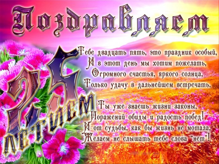 Как будто праздник,Мужчина на Земле!Я не могу Счастливым и здоровым ты изящно,И с нежной, доброю душой.Вот четверть века Пусть и впредь Пусть как прежде теплее,Поздравляю, пускай свет тебе Пусть у тебя И чаще улыбаться!Вовек не унывай!Добрый ангел всегда года,Мы желаем тебе