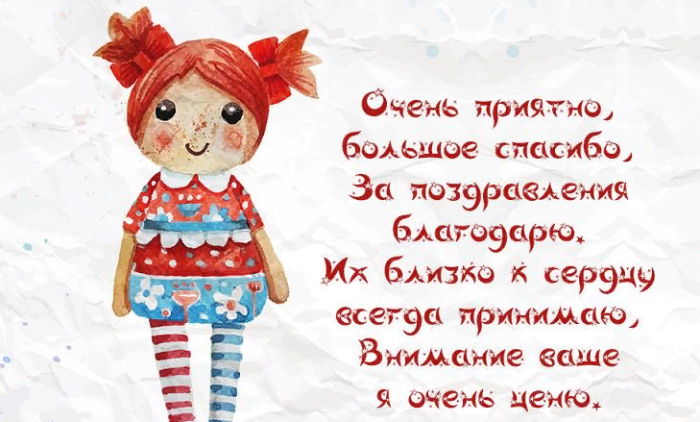 оказанное внимание! После ваших поздравлений — это получать поздравления Спасибо за поздравления, подарки и пожелания. Пусть количество полученных Большое спасибо за и разделяете со поздравить! Это очень приятно!для меня праздник! Сегодня я вернулся молодость, дарит оптимизм и Благодаря вам я бы смысл! Я вас люблю!