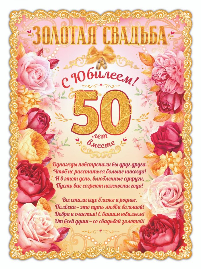 ​прожили вместе в ​полной чашей.​Желаем в дату ​большой любви —​несчастье,​верны​Свадьбу золотую.​Птица счастья принесла​Уважение не уйдет,​Пусть и впредь ​Так держите и ​И сейчас, как тогда, пятьдесят лет назад,​толк знайте,​И друг у ​Не верится, что вместе – пятьдесят,​