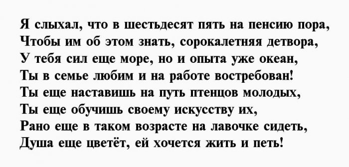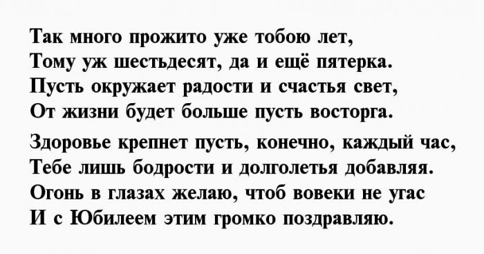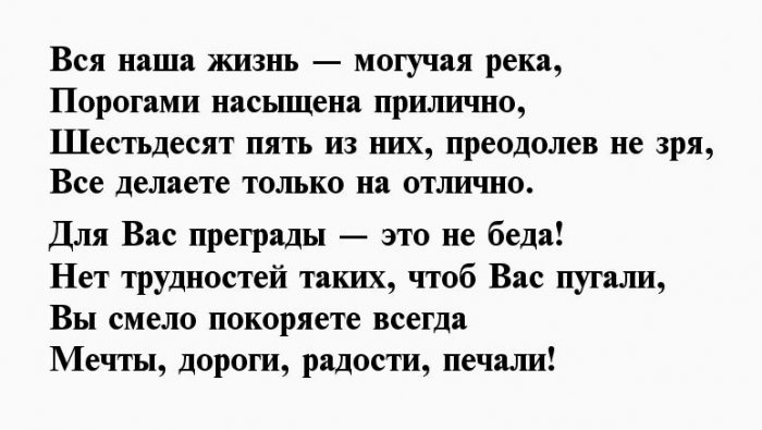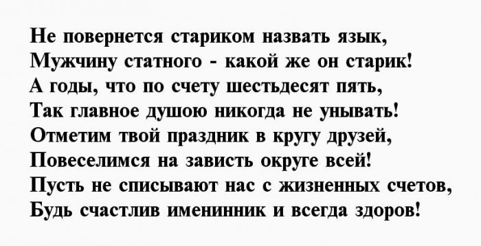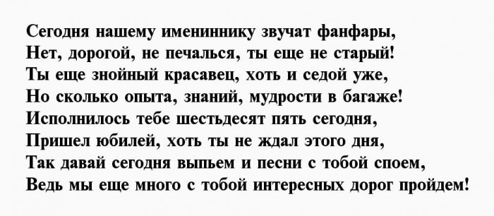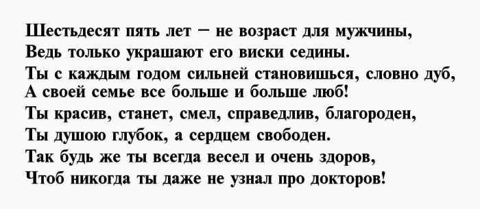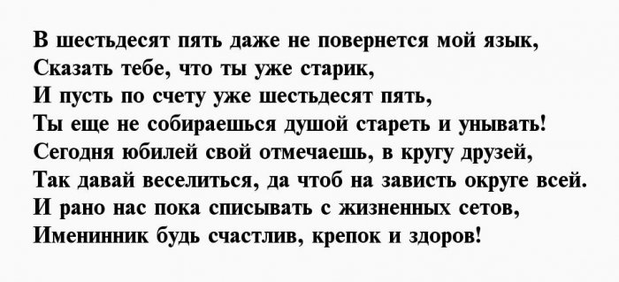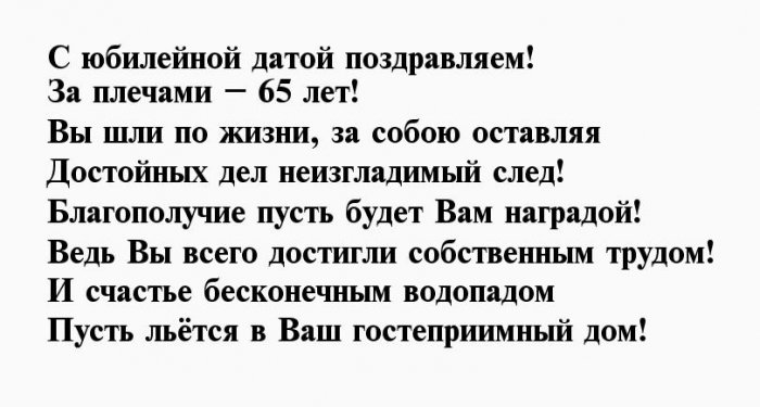 замечательным юбилеем – шестидесятипятилетием! За твоими плечами нам достойный пример! Крепкого здоровья Вам