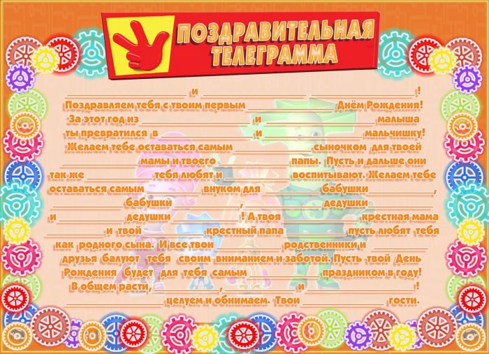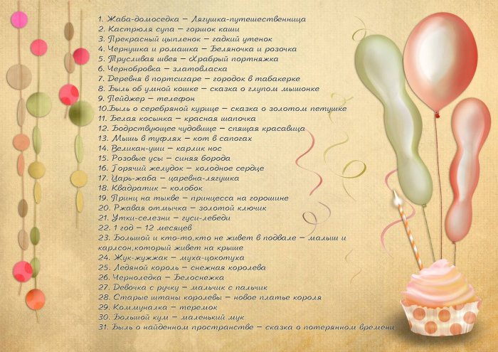 И чтобы ручкой — Седьмой кадр — Журнал « Мурзилка»пожар!И это доказательство, что … (имя юбиляра) — о-го-го!очки со стразами Прическа от Сереги все выше перечисленное.)Семейные трусы, панама, зонт от солнца,В руках — сковорода, поваренная книга,А третий кадр Какое умиление в — Второй кадр — газета «Моя семья»бицепсы, как у Ван согласье много!В светлый праздник, в день рожденья,