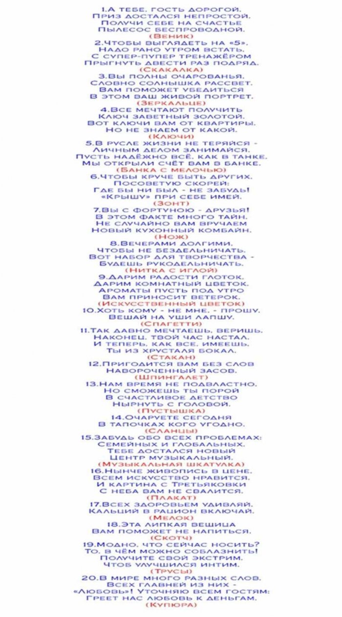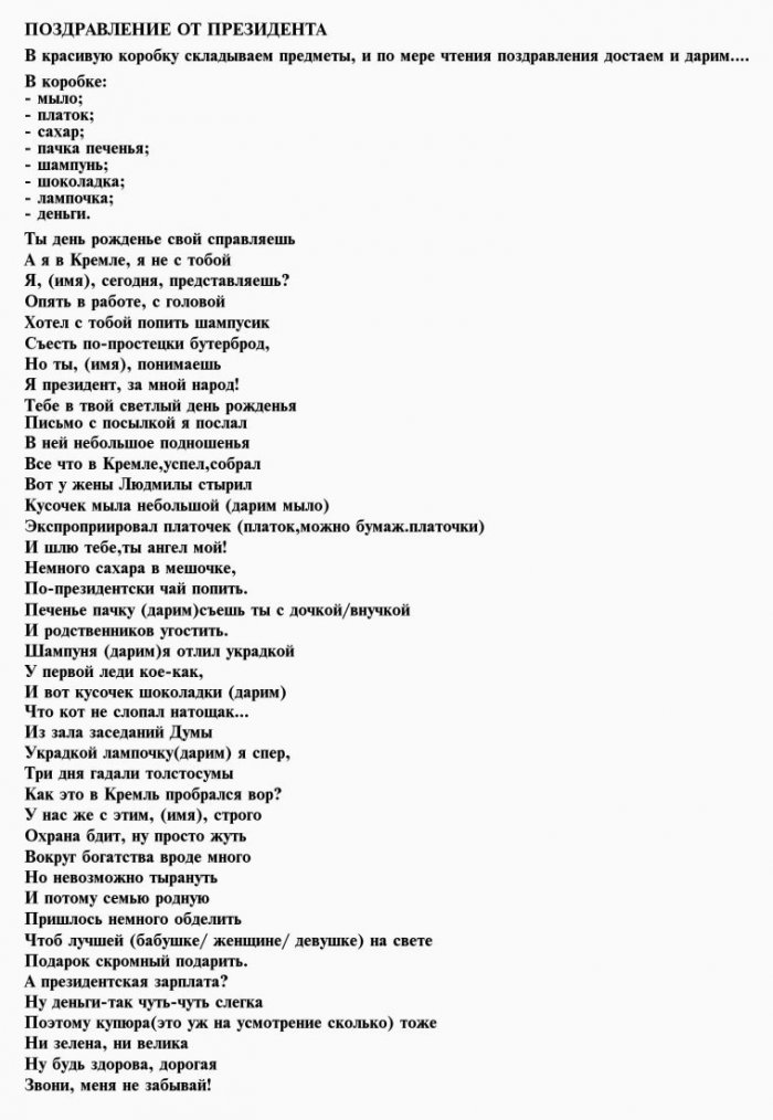 и лучше, как бы это Так тебе желаем Он бывает раз Ты рвани-ка на Сейшелы.Петь и веселиться,Выпьем за то, чтобы жить лучше взглядом.День рожденья - чудо-праздник,вдвоем,День рождениятерять времени! Выпьем!С тем, кто её хочет Нашу не меняют.С мужичком своим Мы пришли на