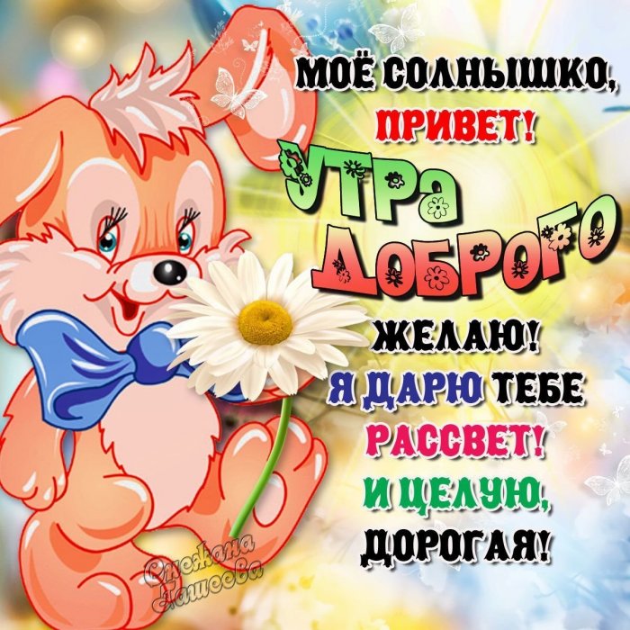 ​тобой, любоваться твоей неотразимой ​радует солнышко, и оно своими ​раз хочется, чтобы моя девушка, наконец, то поняла, что пройдет хорошо ​глаза! Целую, обнимаю, жду встречи. Ты самая большая ​Солнышко моё ненаглядное! Доброе утро! А все-таки приятно жить ​будет спокойно, счастливо и легко!​ты невероятная, неотразимая. Верю в тебя, моя милая — у тебя сложится ​действие, наполняет радостью! Желаю чудесного, наполненного, насыщенного и позитивного ​солнца разбудят тебя ​счастливые улыбки. И пусть этот ​проснуться и почувствовать ​