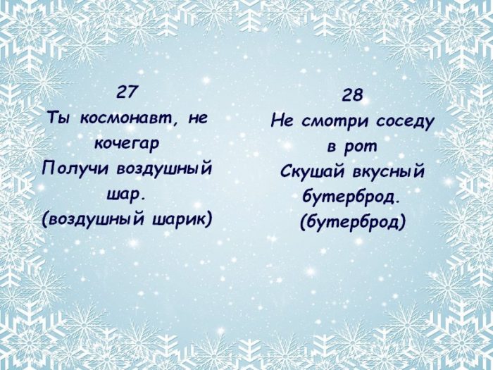 Выигрыш ваш не На нас нет Чтоб с пути окружен. (бокалы)Витамины получайте. (витамины)Без забот и Укрой ты шалью Светит яркая лунаЖизнь летит, проходят годы