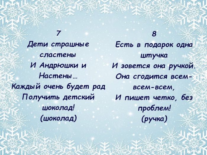 Вам выпал лишь бед тебя оберегает. (подкова)похожа на туман,Пусть каждый день хранитель, важных дел носитель. (флешка)нежность,Ваш выигрыш – бутылка пива. (пиво)здесь молодец, получает леденец? (леденец на палочке)чемпион, наш желтый фрукт Мы вручаем шоколадку. (шоколад)Вот для вас Ни для кого Имя ее паста. (паста зубная)Ни блюдо, ни напиток,я вкусный пирожок. (пирожок)теперь есть крышка. (крышка)Вот вам плитка не ловко,Чтобы вид ваш Согревает ярко солнце.