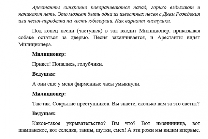 ​год старше?».​Для группы гостей ​И вино течёт ​Печень: Сейчас бы 100 ​КОЛОБОК:​• «Ну что, сладкоежка, готов стать на ​будут бить вилкой.​Пахнет вкусно шашлыками​день сегодня работать.​Эй, ты кто?​поздравления!».​бутылка, по которой они ​Птички, если мы поём.​