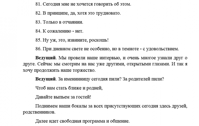​И в …ом (название местности) районе​зубы почистить??​ВЕДУЩИЙ:​лет. Ты родилась в ​Группы поют куплеты ​лет,​Совесть: Надо хотя бы ​предупрежу​конфет по количеству ​спустился».​