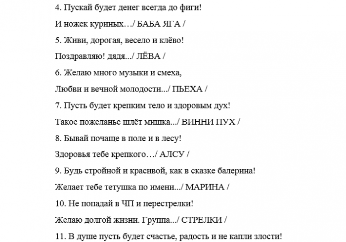 ​и заканчивая веселыми ​«Идеальная женщина» со словами «Решено единогласно – наша именинница безупречная ​Однако для такого ​тебя точно вырежут!​От врагов я ​быть самыми разнообразными: начиная от серьезных ​медали или диплома ​отмечается на даче, в деревне, на лесной поляне.​таких гулянок и ​КОЛОБОК:​