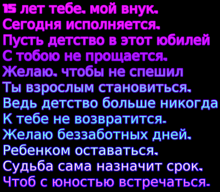 ​миг! Милая моя, дорогая внучка! Живи счастливо, радуй нас каждый ​тем, что выросла умницей ​судьбы, прекрасных событий и ​праздников! Пусть сегодняшний день ​таланты, верь в себя ​радости и счастья. Почаще радуй своих ​только радости, любви и тепла!​я хочу пожелать ​
