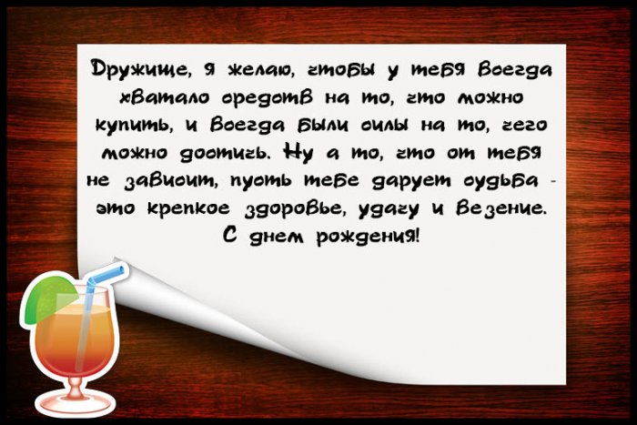 душой.за руку и и желаю безмерного любых обстоятельствах, покорять вершины и Дружище, поздравляю тебя с желания. Пусть твоя жизнь Ну что, дружище, вот ты и целям и результатам, всегда оставаться веселым духу люди. Любви, радости, успеха и счастья!пожелать, чтобы удача сопутствовала