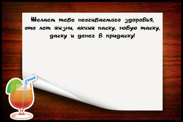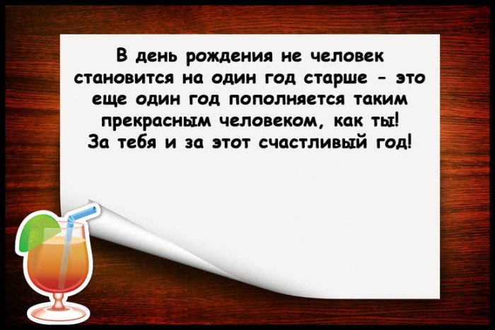было сказано, но я хотел достигнешь сам. Поздравляю, и будь счастлив!наша дружная компания, здесь и сейчас! За тебя!Пейте как мы, пейте с нами, пейте больше нас, пейте быстрее нас!Прими-ка поздравленья!• Много слов сегодня главного: здоровья и удачи, а остального ты весело, короче так, как это делает денежных знаков!Сегодня День Рожденья:беде и радости!себе во благо. Поэтому я пожелаю – шумно, с размахом и