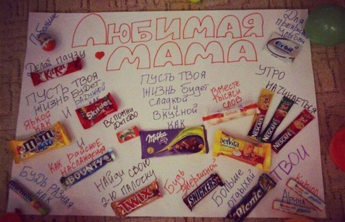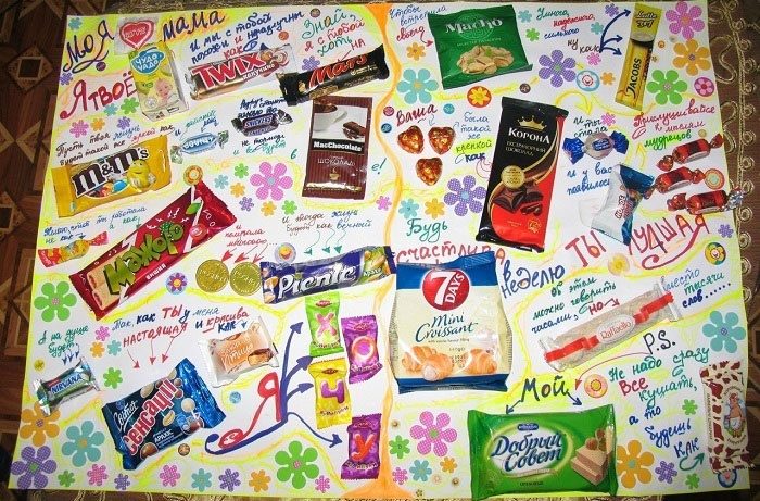 Как сделать плакат на День рождения маме и бабушке из сладостей?