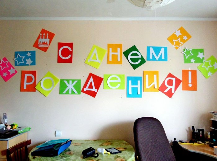 • Из цветной бумаги вырежьте каждую букву. Используйте бумагу разных