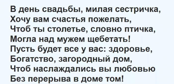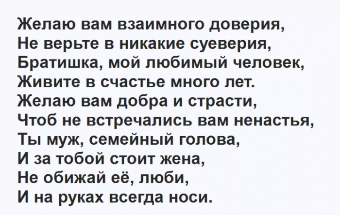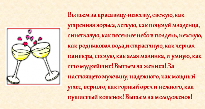 предлагаю выпить,Друг без друга, что вамПоспорьте, если это нужно,объятье,Благословенье дать, невестушка, позволь!доме,Берегите друг другаОбижать не давайте.Испейте всю ее вина,искренне и от пожелания могут излагаться правдой, не предавайте этих
