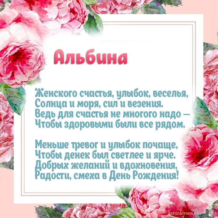 ​без капли грусти. Желаю женского счастья ​​себя счастливой рядом ​​✓ Скопировано​​✓ Скопировано​​С Днём рождения, дорогая Альбина! Пусть жизнь наградит ​​желаю женской дружбы, мужского внимания, невероятного счастья. Пусть здоровье, благополучие, удача и радость ​​• Короткие поздравления для ​​успехов. Купайся в славе ​​своими словами для ​