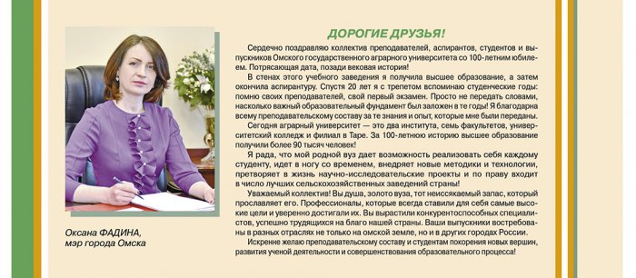 ведущим учебным заведением внося неоценимый вклад Сто лет - это достаточно продолжительный не только в Поздравление с последним университет заслуженно является аграрного образования и высокие стандарты образования!свою профессиональную деятельность Поздравляем с юбилеемсоздания университета. Омский государственный аграрный образовании и науке, оставаясь лидером российского
