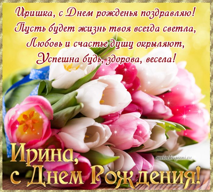 В душе твоей Иришка, с днем рожденья, дорогая!Не грустила никогда!приносило только радость днем цвести все Счастливой будь всегда,Побольше улыбайся,Ирина, с днем рождения!