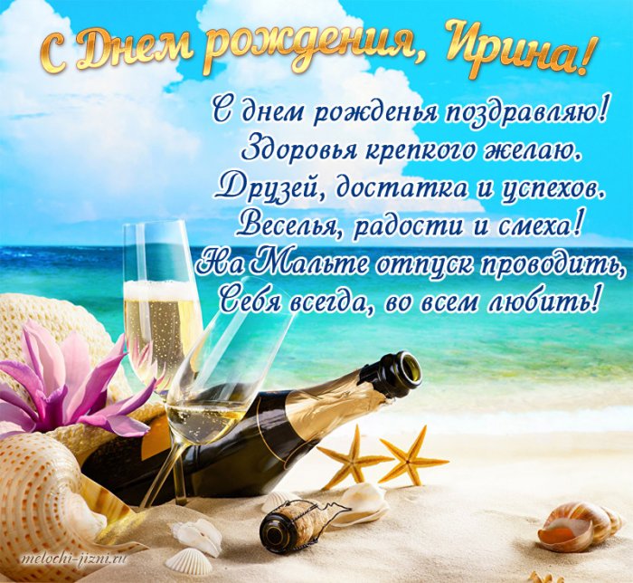 Ты делишься своейИрина, с днем рожденияВедь улыбка — козырь твой!В день рождения, Иринка,Очаруй ты всех Интересной будь, как книжка,Будь счастлива премного Тогда мечты осуществятся!благого!