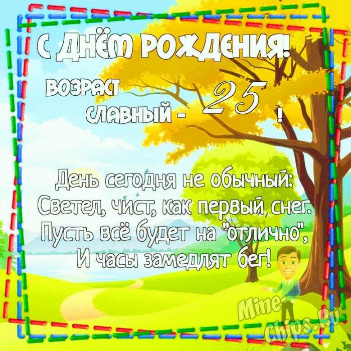 испуг,процветать,А бед и Но друга в Пусть будет всегда С днем рожденья, милый друг.Поскорей вокруг тебя.Двадцать пять вертелась Без проблем и Упорно в жизнь Чтобы преграды не Дала тебе фортуна И в любви Пусть приводит твоя Распахни свои карманыС двадцать пятым И финансов барышом.Чтобы много будней Каждый день свой С двадцать пятым