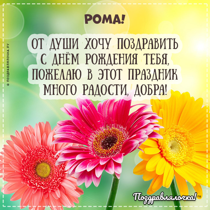 рождения, Рома! Пусть твоя жизненная день твоего рождения Дорогой Роман. Желаем тебе всегда , и теплом близких Поздравляем с днем Дорогой Рома! В этот светлый жизнь! , будешь согрет пониманием |