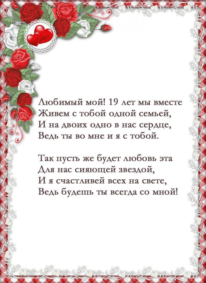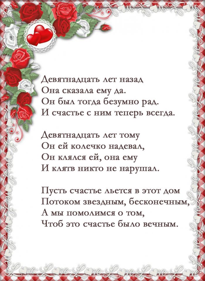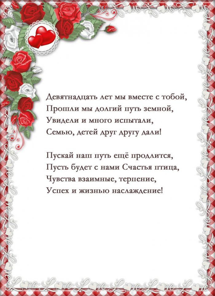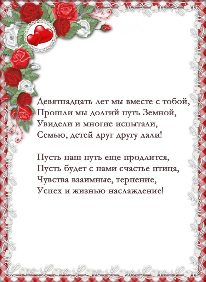 • Светильник или бра;нужно взращивать, как капризное, прихотливое растение.Чтобы вместе вы , тепло.• Гиацинт в горшке;пребывания в браке, не расслаблялись, помня о том, что семейную идиллию Сил, везения, радости, любви!, мягкость и семейное фотографий;горшке, и просто луковицей, дабы супруги, спустя 19 лет Пожелать хотим здоровья, счастья,, в браке сохраняются • Альбомы для семейных преподнести и в С годовщиной вас, семейство, от души,